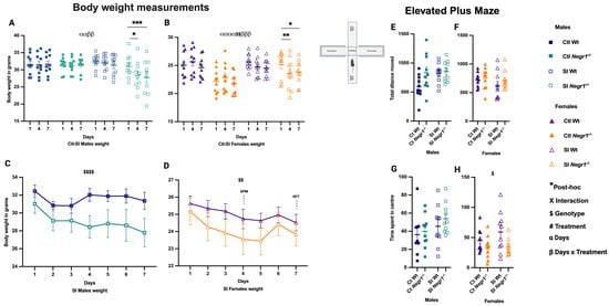 (A) Body weight on Day 1, Day 4, and Day 7 in males (n = 10). (B) Body weight on Day 1, Day 4, and Day 7 in females (n = 10). (C) Body weight dynamics of socially isolated (SI) males across 7 days (n = 10). (D) Body weight dynamics of socially isolated (SI) females across 7 days (n = 10). (E–H) Behavior in the 5 min elevated plus maze on Day 4 in Ctl and SI males and females. Body weight across time points (A,B) was analyzed by three-way repeated-measures ANOVA (factors: days, treatment, genotype) with Bonferroni post hoc tests. Body weight of SI groups (C,D) was analyzed by two-way ANOVA (factors: genotype, treatment) with Bonferroni post hoc tests. Elevated plus maze (E,F). Total distance moved (G,H). Time spent in center was analyzed by two-way ANOVA (factors: genotype, treatment) with Bonferroni post hoc tests. Parametric t-test with Welch’s correction was used to confirm significant effects between two groups. Data are presented as the mean ± SEM. Post hoc significance levels are indicated as * p < 0.05, ** p < 0.01, and *** p < 0.001, with the number of symbols indicating the corresponding significance level. The symbols $, $$ and $$$$ denote the main effect of Genotype at increasing significance levels. The symbol α indicates the main effect of Days, and β indicates the Days × Treatment interaction. Combined symbols (e.g., ααββ or αααα$$ββ) indicate that multiple effects—Days, Genotype, Treatment, and/or their interactions—are simultaneously significant. GraphPad Prism version 10.6.1 was used for data analysis, and the figure panel was created using BioRender scientific image and illustration software.