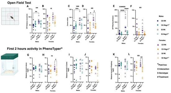 Open field test (OFT): (A,B) Distance moved in arena; (C,D) Corner entries, (E,F) Rearing time (Males, n = 10; females, n = 10). PhenoTyper® (First 2 h) (G,H); Distance moved in Arena; (I,J) Distance moved in Center; (K,L) Distance moved in periphery by Ctl and SI male and female mice [Males (n = 10), Females (n = 10)]. Two-way ANOVA with Bonferroni’s post hoc test (factors: genotype, treatment) was performed. A parametric t-test with Welch’s correction was used to confirm significant effects between two groups. All data are represented as the mean ± SEM and post hoc significance is presented as: * p < 0.05,** p < 0.01, *** p < 0.001, **** p < 0.0001. The number of other symbols consistently denotes the corresponding significance level. The symbol # indicates a main effect of Treatment, while $ indicates a main effect of Genotype. Interaction effects (Treatment × Genotype) are indicated by X. Combined symbols (e.g., X##, X###, XX###$$$, #$, ##$, X$, X$$, $$$) denote that multiple effects—treatment, genotype, and/or interaction—are simultaneously significant. GraphPad Prism version 10.6.1 was used for data analysis, and the figure panel was created using BioRender: Scientific image and illustration software.
