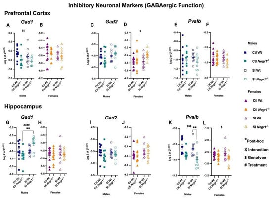RT-qPCR analysis revealed dysregulation of GABAergic markers in the prefrontal cortex. In males, Gad1 expression showed a significant genotype effect (F1,30 = 10.29; p = 0.0032) (Figure 4A), whereas no changes were observed in females (Figure 4B). Conversely, Gad2 expression showed a genotype effect in females (F1,36 = 6.122; p = 0.0182) (Figure 4D), while males showed no difference (Figure 4C). The interneuron marker Pvalb did not differ between groups in either sex (Figure 4E,F). In the hippocampus, both treatment and genotype effects were evident. Gad1 expression was significantly increased in SI Negr1−/− males compared to Ctl Negr1−/− males, supported by a genotype × treatment interaction (F1,35 = 7.540; p = 0.0095) and a treatment effect (F1,35 = 8.920; p = 0.0051) (Figure 4G; ** p < 0.0019). No such changes were observed in females (Figure 4H). Gad2 expression remained unchanged across groups in both sexes (Figure 4I,J). In contrast, Pvalb was reduced in SI Wt males compared to SI Negr1−/− males (F1,33 = 16.39; p = 0.0003) (Figure 4K; ** p < 0.0074). A similar, albeit milder, genotype effect was observed in females (F1,36 = 5.878; p = 0.0205) (Figure 4L). Together, these findings show that Gad1, Gad2, and Pvalb exhibit region-specific and sex-dependent regulation, which may contribute to the behavioral differences observed between males and females. Analyses combining data from both sexes are provided in Supplementary Figure S6. Furthermore, to investigate Pvalb significance between SI Wt and SI Negr1−/− when data were combined, a parametric t-test with Welch’s correction was performed. The related graph can be found in Supplementary Figure S9.