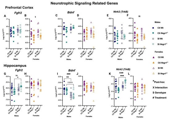 In the prefrontal cortex, Fgfr2 expression did not differ in males (Figure 5A), whereas females showed a genotype effect (F1,31 = 6.74; p = 0.0142), with lower expression in Negr1−/− groups compared to Wt (Figure 5B). Bdnf expression remained unchanged in both sexes (Figure 5C,D). In contrast, Ntrk2 (TrkB) showed a genotype-dependent increase in females (F1,35 = 7.599; p = 0.0092) (Figure 5F), while no differences were observed in males (Figure 5E). In the hippocampus, Fgfr2 was elevated in SI Negr1−/− males compared to Ctl Negr1−/− males, supported by a genotype × treatment interaction (F1,35 = 4.749; p = 0.0360) and a treatment effect (F1,35 = 6.756; p = 0.0136) (Figure 5G; * p < 0.0121). No changes were observed in females (Figure 5H). Bdnf expression showed a strong treatment effect in males (F1,35 = 23.15; p < 0.0001), with SI Wt males exhibiting reduced expression compared to Ctl Wt, and SI Negr1−/− males showing a trend toward reduction relative to Ctl Negr1−/− (Figure 5I; ** p < 0.0017; p = 0.0519) while females showed no significant effects (Figure 5J). In contrast to Bdnf, Ntrk2 expression increased in SI Negr1−/− males compared to Ctl Negr1−/− males, with a genotype × treatment interaction (F1,34 = 10.09; p = 0.0032) and a treatment effect (F1,34 = 12.81; p = 0.0011) (Figure 5K; *** p < 0.0003). No such changes were observed in females (Figure 5L). Combined-sex analyses are available in Supplementary Figure S7. Furthermore to investigate significance between certain groups when data were combined, a parametric t-test with Welch’s correction was performed when data were normal and a non-parametric Mann–Whitney t-test was performed when the data were not normally distributed. A related graph can be found in Supplementary Figure S9.