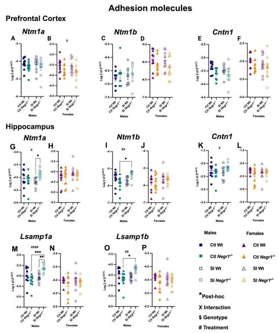 Other IgLON family members also showed marked region and sex-dependent expression patterns. In the prefrontal cortex, Ntm1a was downregulated in Negr1−/− females with a genotype effect, whereas in the hippocampus, both Ntm and Lsamp isoforms exhibited strong genotype x treatment interactions in males, Ntm1a/1b and Lsamp1a/1b transcripts were strongly upregulated in SI Negr1−/− males compared to SI Wt (Supplementary Figure S5). This result is in line with our previous studies showing that in Wt mice, SI does not induce Lsamp1a/1b transcript expression []. These findings suggest that social stress unmasks latent regulatory mechanisms within the IgLON family, particularly in males, supporting our previous results demonstrating that particularly Lsamp, but also Ntm, regulate social and emotional behavior in mice [,,]. Notably, Negr1 RNA itself was not affected by isolation (Supplementary Figure S5), indicating that stress susceptibility likely arises from altered downstream adhesion networks rather than the direct regulation of Negr1.