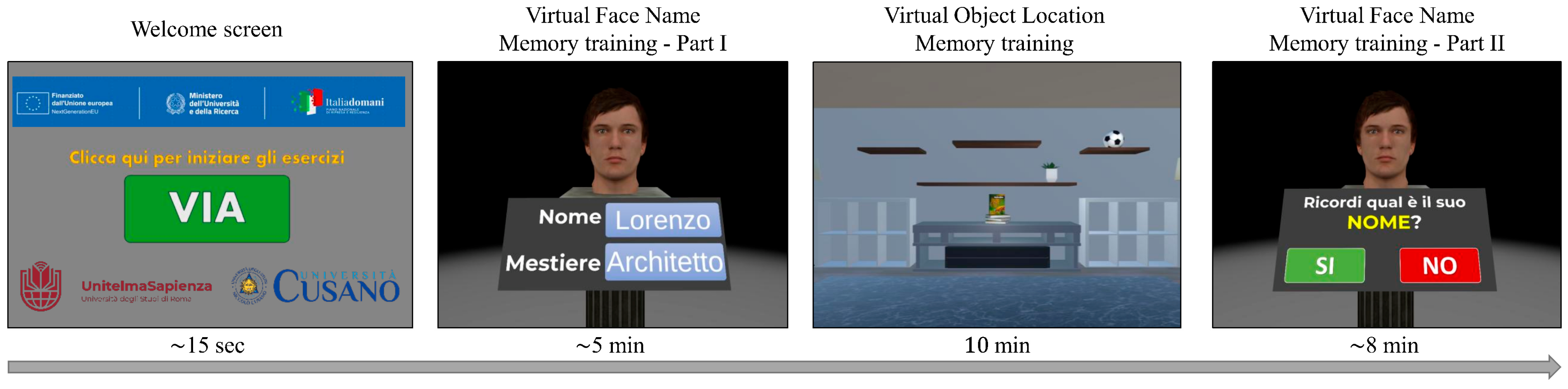 - De Simone, M.S.; Zabberoni, S.; Costa, A.; Tenaglia, E.; Tieri, G. The effects of an immersive virtual reality and telemedicine-based multicomponent intervention in individuals with subjective cognitive decline: Study protocol of a randomized controlled trial. Front. Psychol. 2025, 16, 1591239. [Google Scholar] [CrossRef]