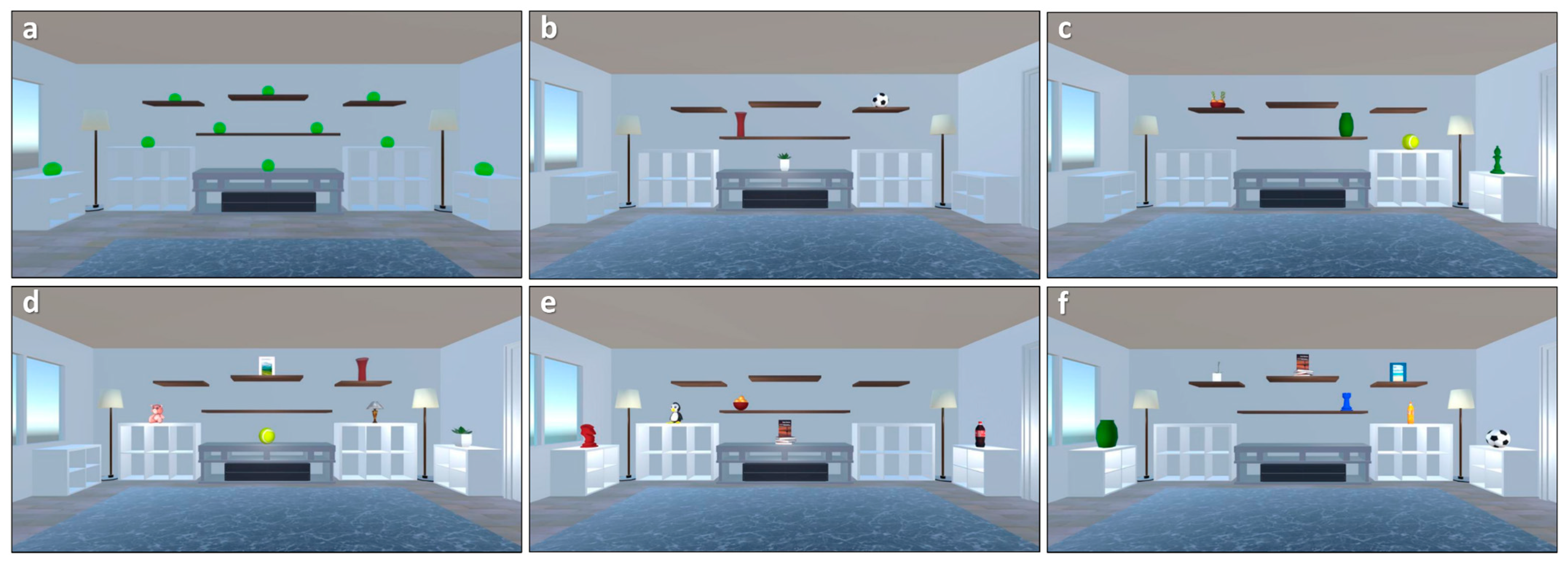- Plechatá, A.; Sahula, V.; Fayette, D.; Fajnerová, I. Age-related differences with immersive and non-immersive virtual reality in memory assessment. Front. Psychol. 2019, 10, 1330. [Google Scholar] [CrossRef]
