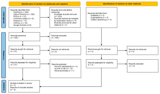 The clinical effects of VR-based interventions in people with MS are supported by converging evidence across systematic reviews and meta-analyses. Most studies report improvements in balance, especially static balance, with some demonstrating clinically meaningful changes after higher session volumes [,]. Exergaming approaches appear particularly effective, with significant gains in Berg Balance Scale scores []. VR has also shown positive effects on fatigue and quality of life, although findings on functional mobility remain inconsistent []. While some reviews confirm the superiority of VR over inactivity [], evidence of advantage over conventional therapy is mixed. Importantly, recent work highlights considerable methodological heterogeneity and stresses the need for standardized protocols to enhance clinical translation []. However, to our knowledge, no previous systematic reviews have specifically examined the application of AR and MR technologies in the field of neurorehabilitation. This represents a significant gap in scientific literature, considering the growing interest in these emerging tools and their potential to complement or enhance existing VR-based interventions.