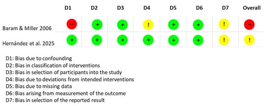 Non-randomized studies were assessed using ROBINS-I V2 (Risk Of Bias In Non-randomized Studies of Interventions), chosen because it is specifically designed to evaluate internal validity in observational or quasi-experimental designs in which randomization is not feasible. It assesses seven domains, including confounding, classification of interventions, participant selection, deviations from intended interventions, missing data, measurement of outcomes, and selective reporting. This tool applies structured decision algorithms to convert responses into domain-level and overall risk-of-bias ratings (low, moderate, serious, or critical). Its use ensures methodological consistency and comparability across non-randomized designs [,].