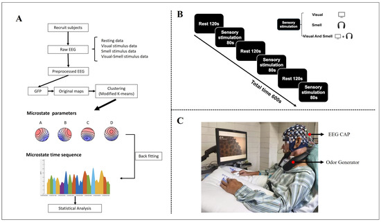 To ensure comparability across individuals and consciousness levels, a unified global template strategy was used. A resting-state global template was constructed by pooling resting EEG data from all participants, while a task-state global template was constructed by integrating EEG recorded during visual, olfactory, and combined visual–olfactory stimulation. This approach ensures that the templates capture shared spatial patterns across different sensory conditions and consciousness levels [31,34]. All microstate segmentation and parameter extraction were performed based on these global templates.