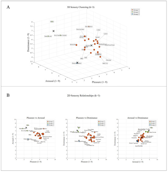 The selection and presentation of olfactory stimuli followed a standardized procedure involving subjective rating, cluster analysis, and calibration of physical delivery parameters. A total of 17 healthy participants were recruited to evaluate 16 odors using the Self-Assessment Manikin (SAM) scale, rating each stimulus on three dimensions: valence (pleasantness, V), arousal (A), and dominance (D). Subsequently, K-means clustering was performed on the SAM ratings to identify three representative odor groups. Figure 2 presents the clustering results: (A) a 3D scatter plot illustrating the spatial distribution of the three groups across the V/A/D dimensions, and (B) 2D relational plots highlighting clustering differences via pairwise dimensional relationships. The three distinct groups were defined as: Group 1 (high-valence low-arousal, e.g., mint shamboo; 7.2 ± 0.8/4.8 ± 0.6/4.5 ± 0.7), Group 2 (low-valence medium-arousal, e.g., durian; 2.3 ± 0.5/5.2 ± 0.5/4.9 ± 0.8), and Group 3 (medium-valence high-arousal, e.g., hotpot; 4.6 ± 0.7/6.8 ± 0.9/5.3 ± 0.6). Finally, an S400 olfactometer (Judian Technology Co., Ltd., Hangzhou, China)delivered the olfactory stimuli at a flow rate of 0.5 L/min, with the stimulation duration synchronized to the 80 s task-state period of the visual condition.
