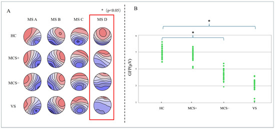 Resting-state microstate topographies across groups (HC, MCS−, and VS patients). (A) Group-level microstate topography and GFP peak distribution (B).