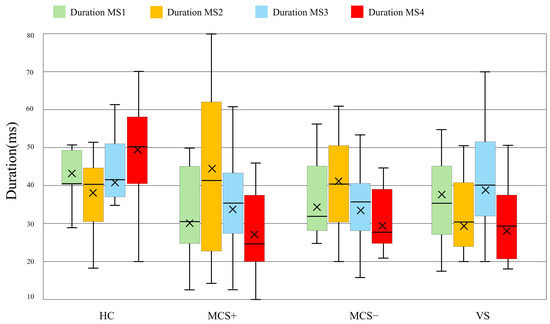Duration of microstates in DOC patients and HC at rest state. Boxplots depict the distribution of microstate durations for HC, MCS+ and MCS−, and VS groups. Boxplots show 1st quartile, median, and 3rd quartile as well as mean values (large cross).