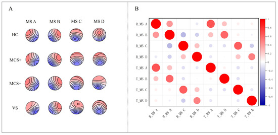 To assess the potential impact of template selection on task-state analyses, a task-state global template was constructed from the combined task-state dataset. TANOVA revealed no significant differences in the spatial distributions of the four microstate classes between the task-state and resting-state templates (p > 0.1), as shown in Figure 5A, indicating that task stimulation did not substantially alter the fundamental spatial patterns of EEG microstates. Spatial correlation analysis further demonstrated strong concordance between the corresponding microstate topographies of the two templates (MS A r = 0.82, MS B r = 0.72, MS C r = 0.76, MS D r = 0.71; p < 0.001), as illustrated in the heatmap (Figure 5B), supporting the similarity in their spatial topological organization.