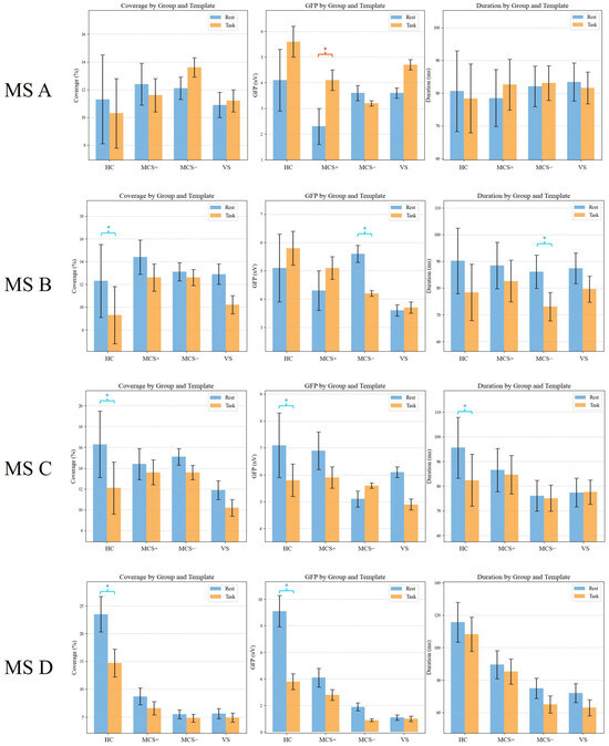 Quantitative analysis of microstate parameters (coverage, GFP, and duration) for MS A–D across groups (HC, MCS+, MCS−, and VS) under resting-state and task-state templates. Red * indicates task > rest (p < 0.05); blue * indicates rest > task (p < 0.05).
