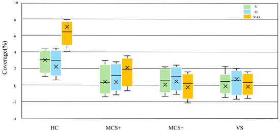 Given that Microstate D was the only microstate showing a graded difference across DOC severity levels during the resting state, the task-state analysis focused on the dynamic modulation of Microstate D. The linear mixed-effects model revealed a significant interaction between stimulus type and group (F(6, 216) = 4.92, p = 0.042), indicating that the effect of multisensory stimulation on Microstate D differed across consciousness levels (Figure 7). In HC group, follow-up LMM contrasts showed that combined visual–olfactory stimulation elicited significantly greater increases in Microstate D coverage compared with unimodal visual or olfactory stimulation. The estimated coverage changes were approximately 3.1 percent for V, 2.7 percent for O, and 7.2 percent for V-O. The overall effect of stimulus type within HC remained significant under the LMM framework (F(2, 24) = 9.81, p < 0.001, ηp2 = 0.24). Follow-up pairwise LMM contrasts confirmed that V-O stimulation resulted in significantly greater increases than both V (p = 0.003) and O (p = 0.007). Among DOC patients, only the MCS+ group demonstrated a modest but detectable increase in Microstate D coverage in response to V-O stimulation (2.1 percent), whereas the MCS– and VS groups showed no significant task-related modulation under any stimulation condition (all LMM contrasts p > 0.1). These findings indicate that preserved task-evoked flexibility of Microstate D is specific to the MCS+ subgroup.