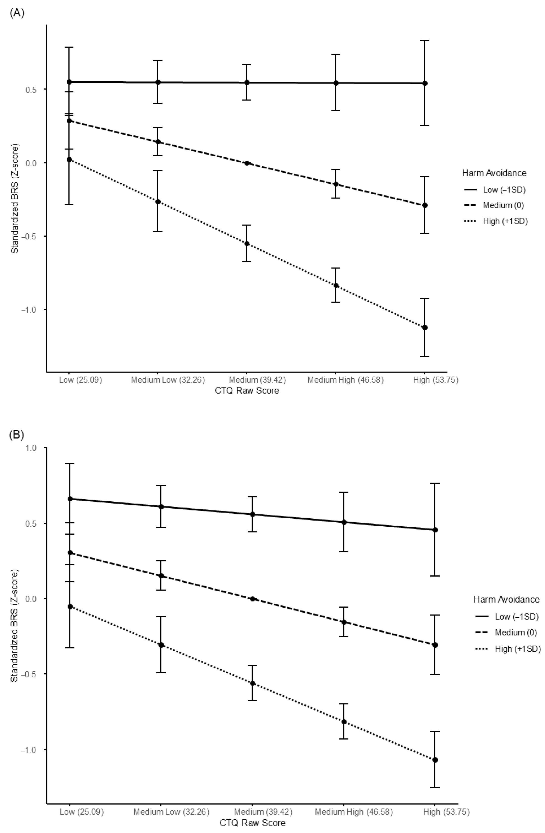Figure 2. Moderating effect of harm avoidance in the (A) CTQ–BRS–PHQ-9 Model and (B) CTQ–BRS–GAD-7 Model.