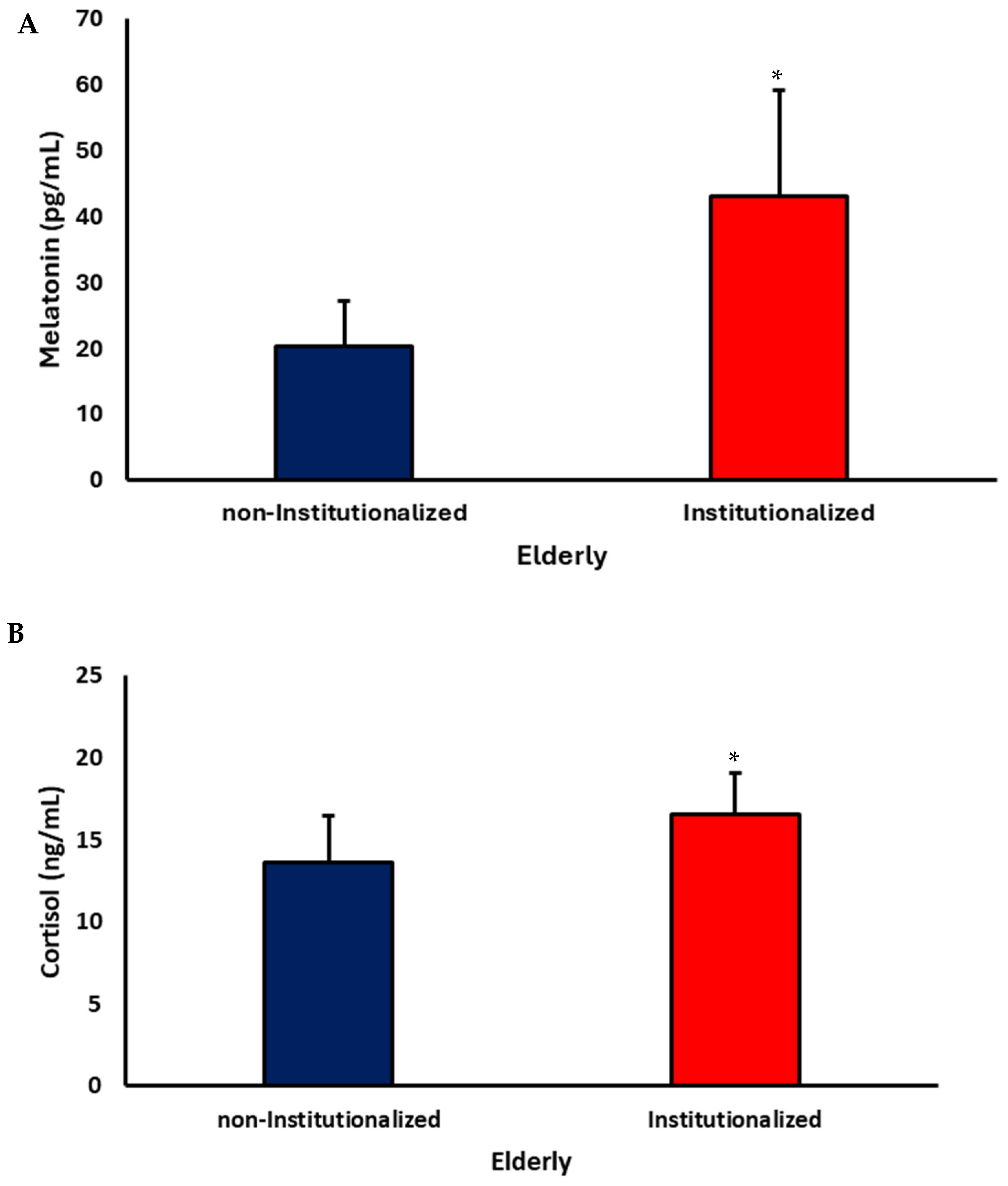 Sfredo, A.d.S.; Silva, M.A.B.d.; Melo, L.V.L.; França, D.C.H.; Dantas, G.L.; Santos, W.B.d.; Fagundes-Triches, D.L.G.; Marchi, P.G.F.d.; Honorio-França, A.C.; França, E.L. Hormonal and Cytokine Imbalances Promote a Proinflammatory Profile in Institutionalized Elderly. Brain Sci. 2025, 15, 1310. https://doi.org/10.3390/brainsci15121310