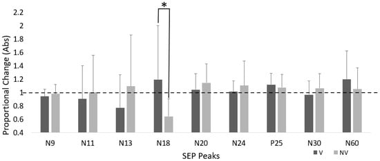 There was a significant time–group interaction for the N18 SEP peak, where amplitude increased 19.3% in the V group and decreased by 35.6% in NV (F(1,23) = 5.046, p = 0.035, ηp2 = 0.180).