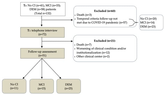 Twelve months after the baseline evaluation (T0), a telephone interview was structured to gather updated information on the patient’s clinical status and to verify whether caregivers were available for the in-person assessment. All patients initially enrolled in the study (n = 132) were considered to begin the follow-up phase. As outlined in Figure 1, 60 individuals were no longer eligible for follow-up (3 patients had died, while the remaining 57 could not be reassessed within the planned timeframe because the COVID-19 pandemic had shifted their follow-up dates beyond the acceptable window). These exclusions involved all three baseline cognitive groups (No CI = 20, MCI = 14, DEM = 23), thereby reducing the eligible sample to 72 individuals.