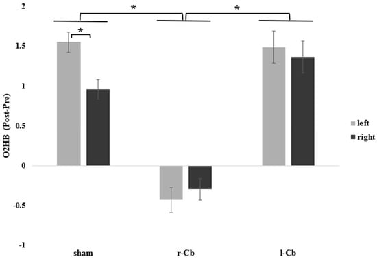 Differences in the neural activation index (Post-Pre) showing a reduction in O2HB levels in the PFC following r-Cb stimulation (as compared to sham and l-Cb stimulation) and greater O2HB levels in the left compared to the right hemisphere under sham stimulation (no hemispheric differences were observed under r-Cb or l-Cb stimulations); error bars represent standard error, * = significant for p < 0.05, Bonferroni corrected.