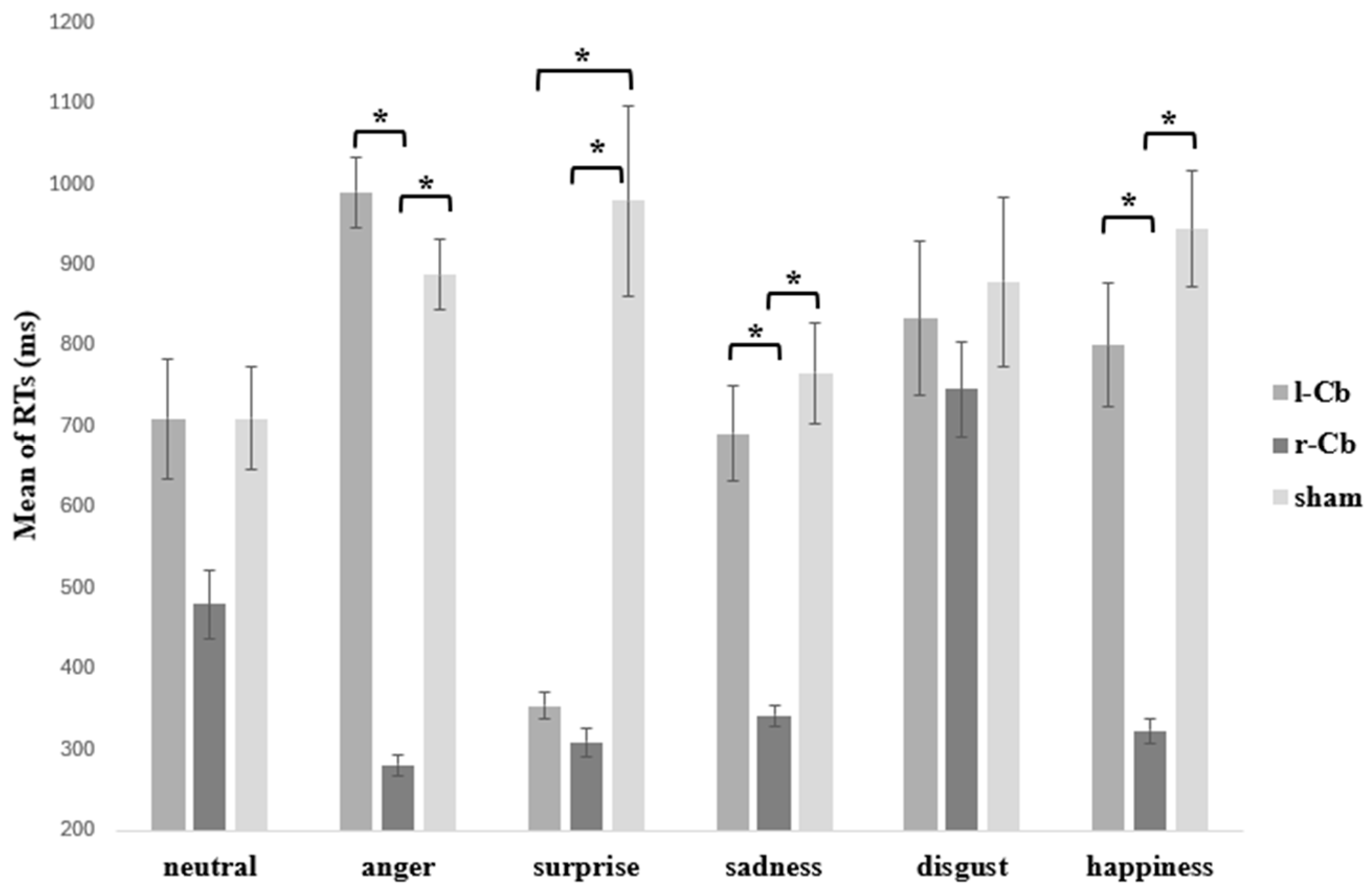 | Emotion | l-Cb (Mean ± SE) | r-CB (Mean ± SE) | Sham (Mean ± SE) | Total (Mean ± SE) | 95% CI for the Mean CI Lower–CI Upper |