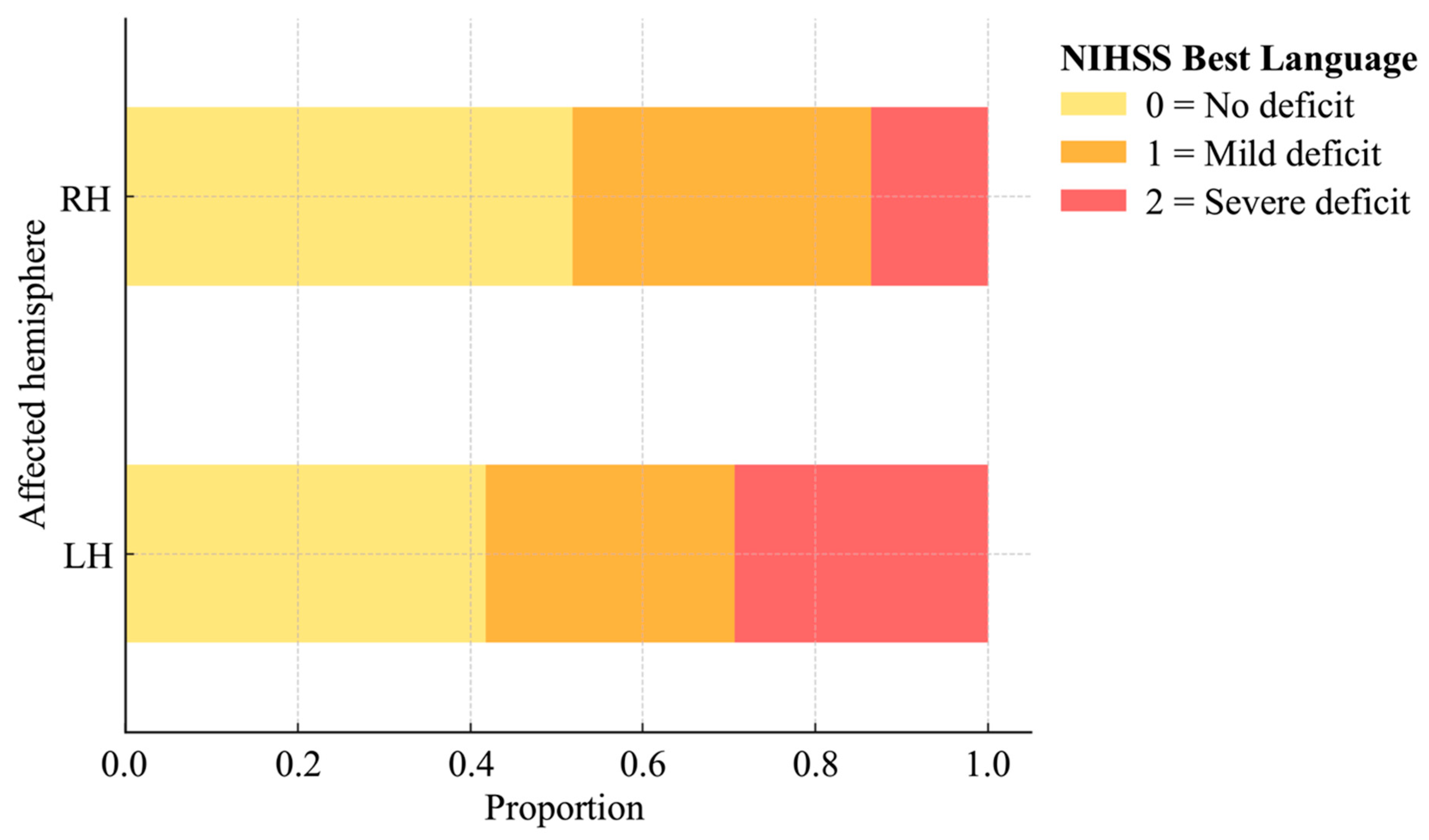 - Martzoukou, M.; Nousia, A.; Nasios, G. Undetected language deficits in left or right hemisphere post-stroke patients. Appl. Neuropsychol. Adult 2025, 32, 606–614. [Google Scholar] [CrossRef]