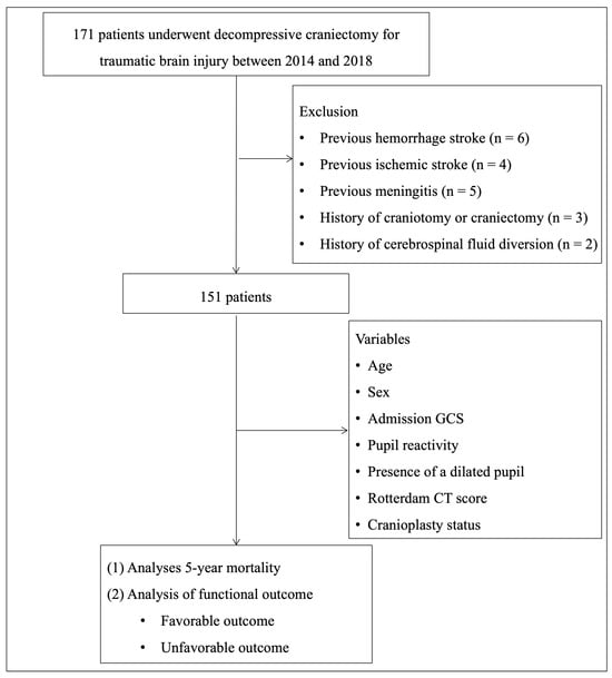 A total of 171 patients underwent DC for TBI during the study period. We excluded patients with previous hemorrhage stroke (n = 6) or ischemic stroke (n = 4), previous meningitis (n = 5), history of craniotomy or craniectomy (3), and prior cerebrospinal fluid (CSF) diversion procedures—such as ventriculoperitoneal shunt or endoscopic third ventriculostomy (n = 2). After applying these criteria, 151 patients were included in the final analysis. A study flow diagram illustrating patient inclusion and exclusion has been added as Figure 1. All operations were performed by four attending neurosurgeons using a standardized trauma flap technique. The indications for DC were based on the Brain Trauma Foundation guidelines for the management of intracranial pressure (ICP) after TBI, 4th edition [24]. Surgical criteria included an intracranial mass lesion with a midline shift greater than 10 mm, hematoma volume exceeding 30 mL (supratentorial) or 10 mL (infratentorial), or an admission Glasgow Coma Scale (GCS) score below 8. Patients with sustained ICP above 20 mmHg or progressive neurological deterioration were also candidates for surgery. In most cases, DC was accompanied by wide dural expansion using an artificial dural graft, and hematoma evacuation was performed when indicated. Postoperative therapeutic hypothermia was applied in cases of refractory brain swelling or excessive intraoperative brain bulging after DC.