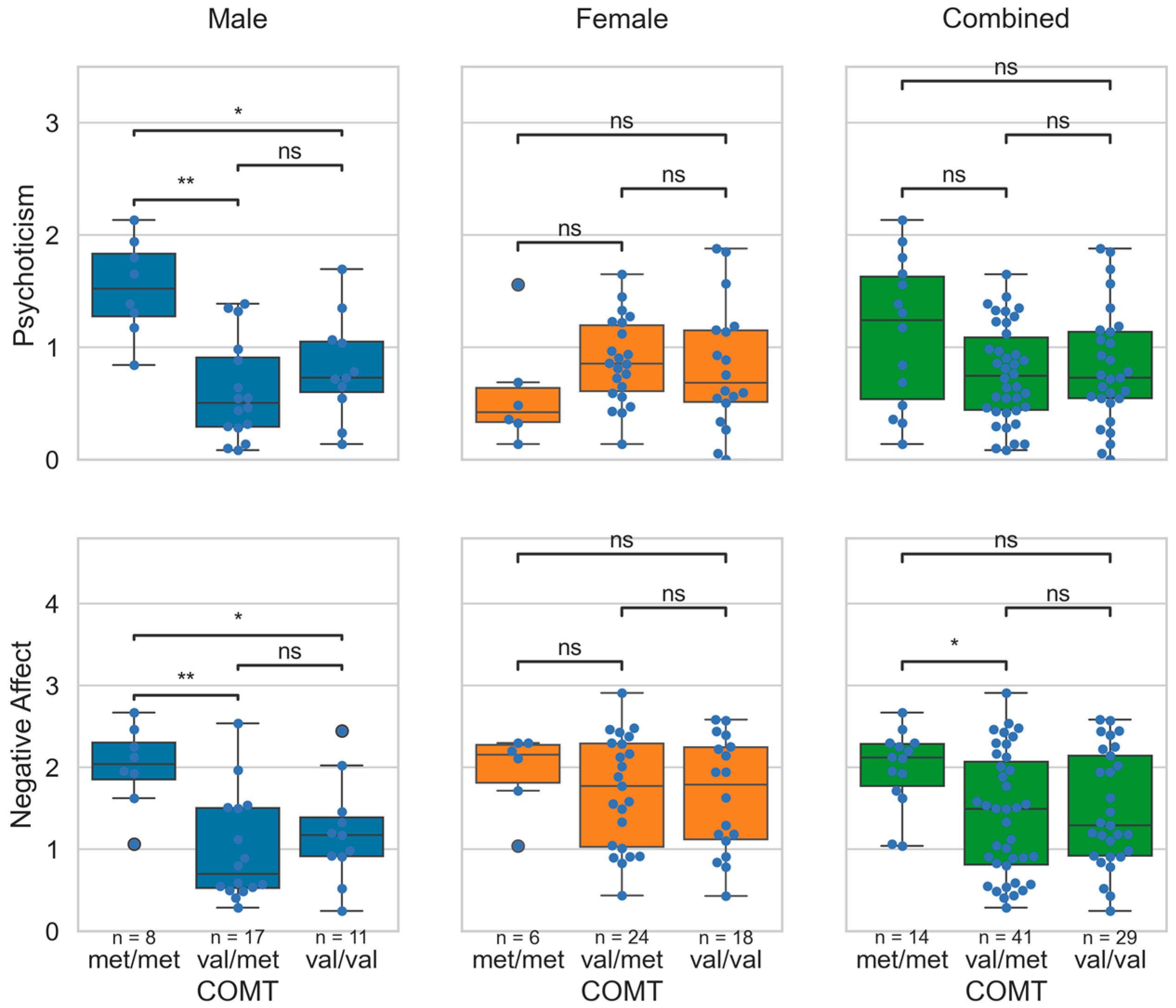 - Chen, C.; Chen, C.; Moyzis, R.; Dong, Q.; He, Q.; Zhu, B.; Li, J.; Li, H.; Li, J.; Lessard, J. Sex Modulates the Associations Between the COMT Gene and Personality Traits. Neuropsychopharmacology 2011, 36, 1593–1598. [Google Scholar] [CrossRef] [PubMed]