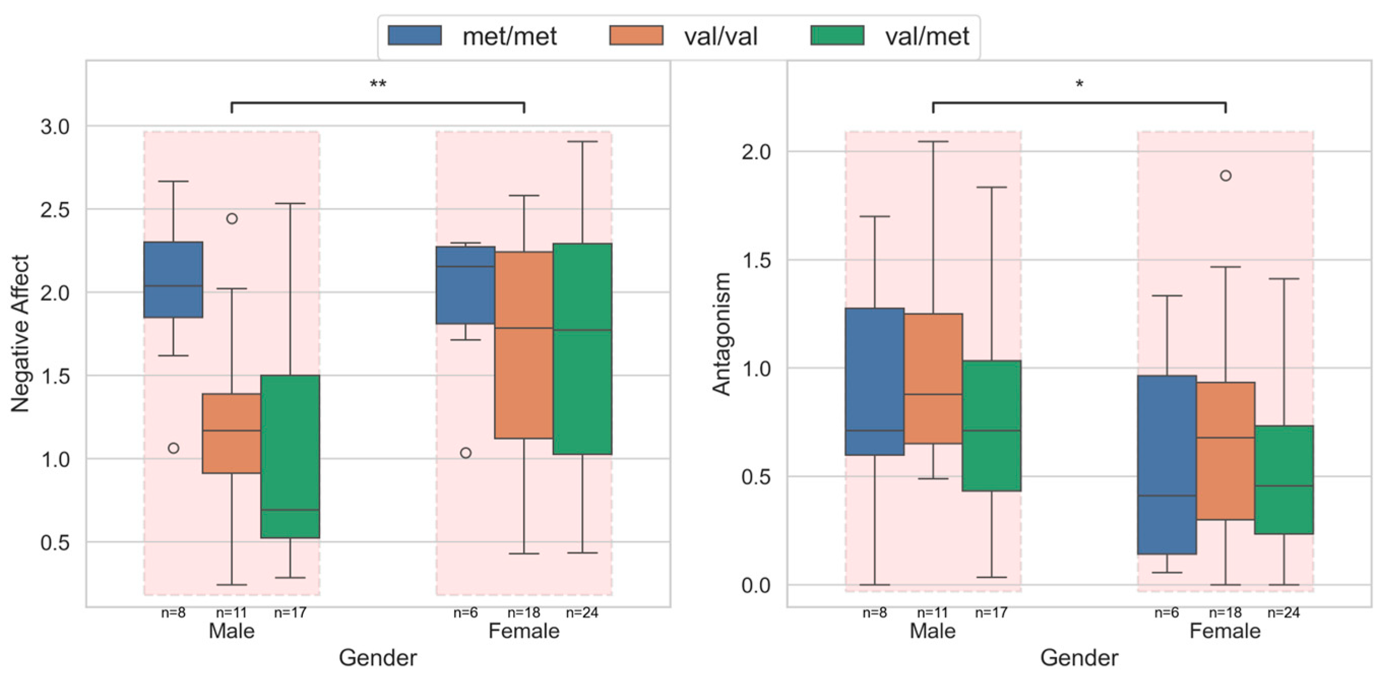 3.1. Pathological Personality Traits Across Gentopyes of the Val158Met COMT Polymorphism