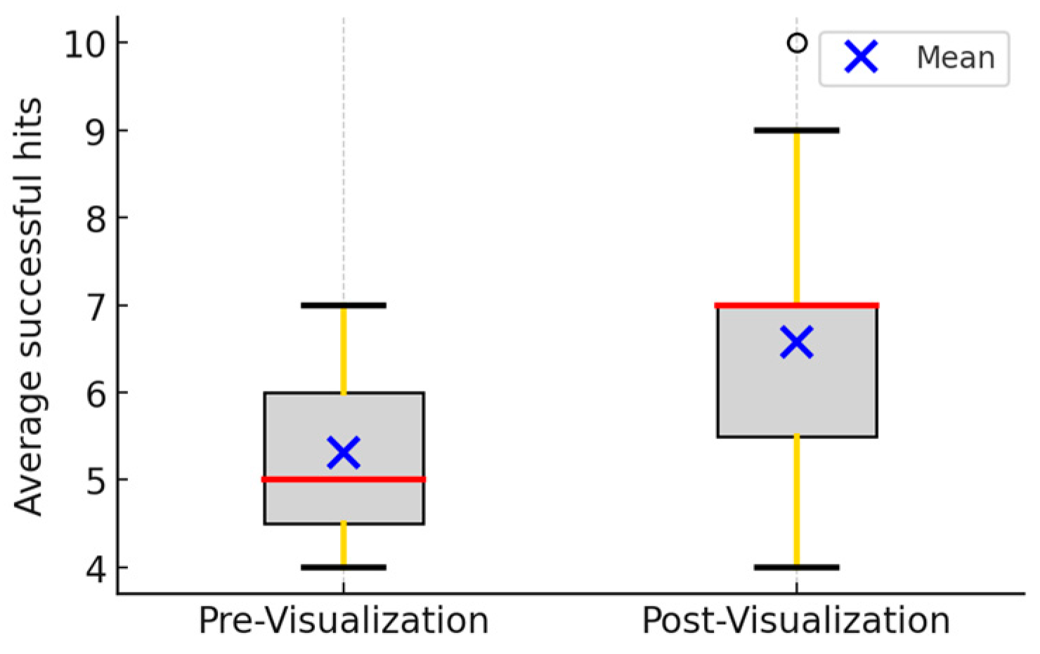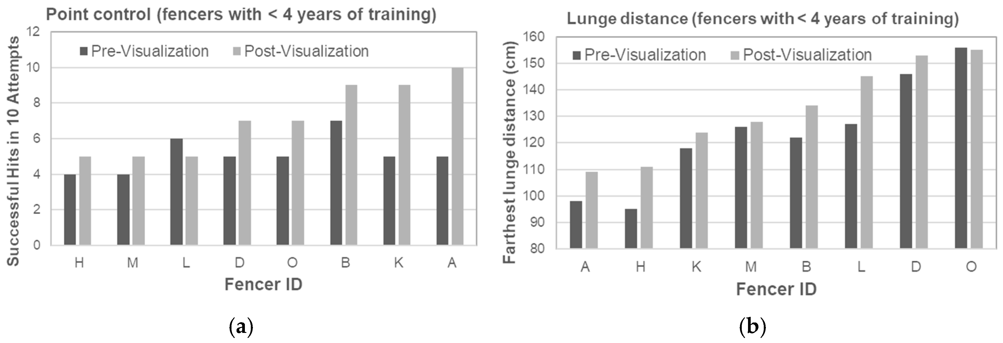 - Point Control: Fencers with <4 years of experience showed greater improvement, increasing from 5.1 to 7.1 hits (39.0%) (Table 3, Figure 3a). Those with ≥4 years of experience improved from 5.5 to 6.2 hits (14.8%) (Table 4, Figure 4a). These differences are consistent with evidence that novices benefit most from visualization in skill acquisition [3,4].