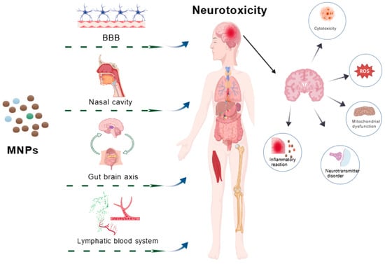 The pathways and possible mechanisms of neurotoxicity induced by micro/nano plastics. Microplastics/nanoplastics induce brain inflammation, cytotoxicity, mitochondrial dysfunction, neurotransmitter disorders, oxidative stress, and other neurotoxicity through the blood–brain barrier, nasal inhalation, gut–brain axis, lymphatic and hematological systems. Abbreviation: MNPs, micro and nanoplastics; BBB, blood–brain barrier; ROS, reactive oxygen species.