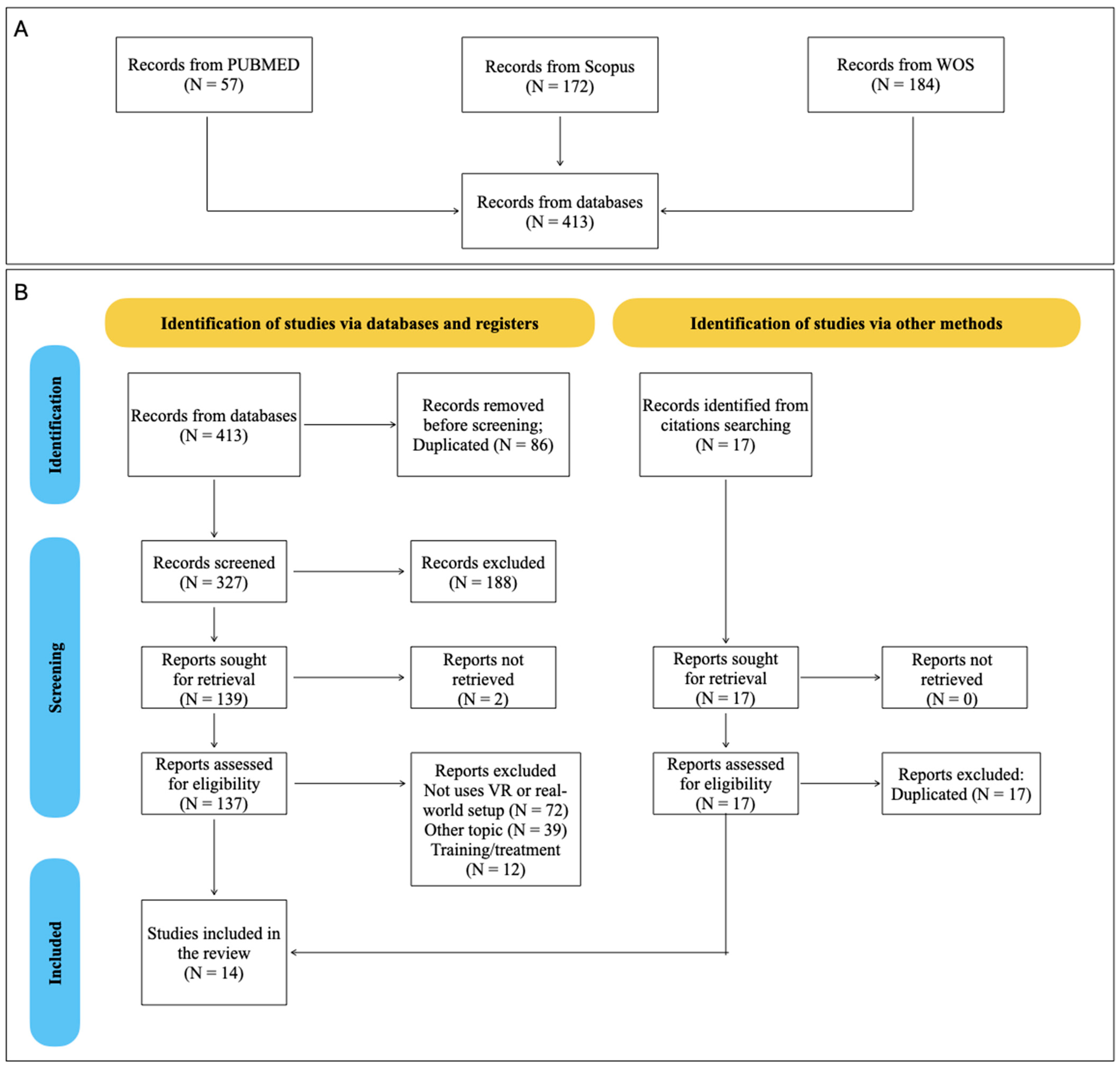| Others | No timing restrictions; virtual reality and natural setups; studies reported in English; published studies in peer-reviewed journals. |