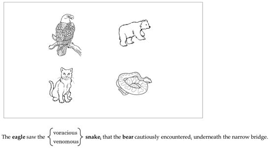 Of interest to the current study, research has also shown that lexical activation may be modulated by the lexical–semantic relationships between sentence constituents. Akhavan et al. [13] used semantic cues to explore whether lexical activation can be facilitated in IWA and age-matched controls. In this ETL study, lexical activation was measured while participants listened to sentences and viewed images on a screen that corresponded to lexical items in the sentence. Eye-tracking was used to track the location of gazes over time as a proxy measure for lexical activation during sentence processing. Akhavan et al. [13] presented participants with sentences that either contained an adjective that was semantically biased (i.e., venomous in sentence (2a)) or unbiased (i.e., voracious in sentence (2b)) toward the upcoming noun (i.e., snake). While listening to sentences, participants would see a visual display with four images. Three of the images were of the nouns in the sentence (i.e., eagle, snake, and bear) and the other image was an unrelated noun (i.e., cat).