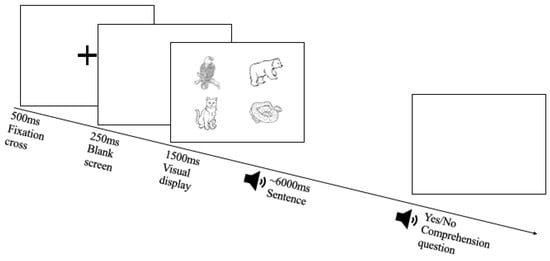 Participants listened to sentences over headphones while viewing the four images on the screen. Participants were situated in front of the computer screen with an attached Tobii X-120 eye-tracker with a distance of 60 cm between their eyes and the eye-tracker. The eye-tracker was calibrated at the beginning of each experimental session. Across each trial, change in pupillary diameter was sampled at a rate of 60 Hz, recording about every 17 ms. Stimuli were presented using E-Prime 2.0 software [35]. For every trial, a fixation cross was presented for 500 ms to give the participant time to fixate and adjust, followed by a blank screen for 250 ms. Then, the image display was presented for 1500 ms before the auditory sentence began and remained on screen for 500 ms after the end of the sentence. Presentation of auditory sentences lasted around 6000 ms while visual stimuli remained on the screen. To keep participants on track, comprehension questions were administered where participants were asked a yes–no question after each trial (e.g., “Was the bear under the narrow bridge?”), responding via a button box using their left, non-paretic hand (see Figure 2 for a depiction of the procedure). Each experiment began with 10 practice trials to confirm understanding of the task.