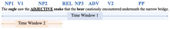Within the field of language processing, research has demonstrated that some individuals with aphasia (IWA) show deficits in lexical-level processing [1]. It has been argued that lexical-level processing impairments can have downstream effects on sentence comprehension abilities, especially for those sentences that do not follow the language’s typical (canonical) word order [2,3]. A large body of research has investigated the underlying source of real-time sentence processing deficits in IWA, suggesting that the slowed processing of lexical and/or syntactic components leads to breakdowns in the time course of sentence processing and, ultimately, sentence comprehension [4,5,6,7,8]. Processing models that focus on lexical-level deficits propose that delays in the activation or integration of lexical–semantic information lead to disruptions in the formation of syntactic structure building and, ultimately, sentence comprehension in IWA.