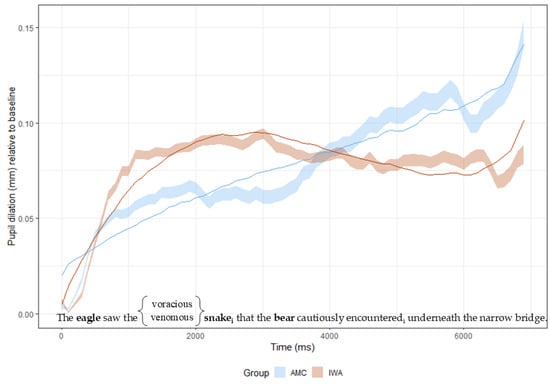 The pattern described for the AMC group differs from what is seen for IWA (red line, Figure 4). Unlike the AMC group, IWA do not show a continual increase in pupillary response—possibly indicating a plateau in processing effort (see Discussion for more details). While the IWA evince an initial peak in pupillary response upon hearing the first noun (‘the eagle’) similar to the AMC group, this initial increase surpasses that of the AMC group, indicating more processing effort at the beginning of the sentence. As the sentence continues to unfold, unlike the AMC group, the initial increase in pupillary response plateaus. There is no modulation in pupillary response at the relativizer (‘that’) or the main verb (‘encountered’), which are interpreted here as reflecting a “cognitive overload” [46]. This lack of an effect is described in detail in the Discussion section.