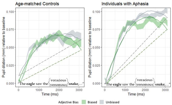 As stated above, we focus here on how semantic cueing affects the time course of the processing effort during initial lexical activation. Semantic cues were presented through semantically biased and unbiased adjectives preceding a target noun. The goal was to determine whether a semantically biased adjective (e.g., in (2a) ‘venomous snake’ compared to (2b) ‘voracious snake’) helps to boost the lexical–semantic access of the upcoming noun by reducing the processing effort. Based on the prior semantic biasing research, we hypothesized that the sentences with semantically biased adjectives would result in smaller pupillary responses (i.e., less processing effort) than sentences with unbiased adjectives i.e., [31] for the AMC group (see for example, [31]). In contrast, for IWA, there are three possible outcomes in response to the semantic biasing. The first outcome is no change in pupillary response. This would reflect the impaired access to the semantic information provided by the biased adjectives, resulting in an overall failure to integrate as suggested by lexical integration deficit accounts [9,10,11,12]. The second possible outcome is an immediate decrease in pupillary response upon hearing the biased adjective, similar to the AMC group. This would reflect the immediate access to the semantic representation and spared lexical–semantic processing, as supported by Chapman and Hallowell [18]. The third outcome is a delayed decrease in pupillary response in the biased adjective condition. We argue that such a delay would disrupt timely integration, thus supporting the delayed activation hypothesis [3,4,6].