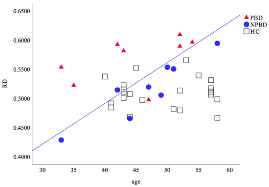 | DTI Measure | PBD | NPBD | HC | 3 Groups ANOVA (F) | 3 Groups ANOVA (p) Effect Size (η2) | 3 Groups Group × Age (p) Effect Size (η2) | 3 Groups Group × Gender (p) Effect Size (η2) | PBD vs. NPBD (p) Effect Size (95% CI) | PBD vs. HC (p) Effect Size (95% CI) | NPBD vs. HC (p) Effect Size (95% CI) |