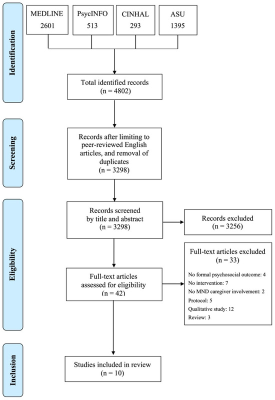 This scoping review aimed to map the breadth of psychosocial outcomes which have been investigated by non-pharmacological interventions involving caregivers of pwMND. To our knowledge, this is the first review to explore this area. From an initial return of 4802 citations, 10 were eventually considered eligible for inclusion in the review. Half of these studies were RCTs [36,37,41,42,43], while the other five adopted a pre–post design [34,35,38,39,40]. A total of 10 main psychosocial outcomes were identified in the included studies: anxiety and depression symptoms, psychological distress, resilience, caregiver burden, caregiver preparedness, problem-solving, self-efficacy, quality of life, spiritual wellbeing, and mindfulness.