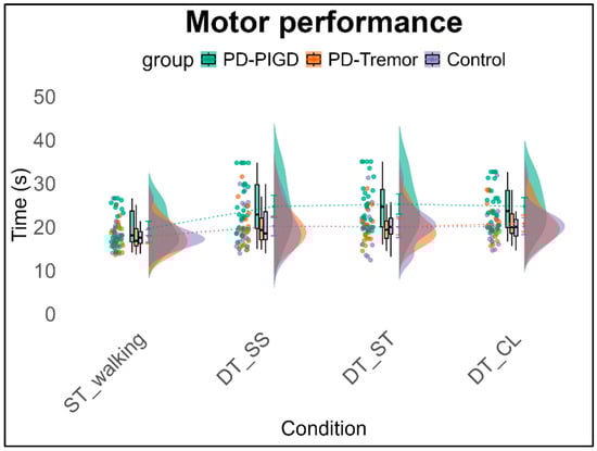Motor performance (time in s) across groups under single-task and the three dual-task conditions. Note: ST = Single task, DT = Dual task, walking condition, SS = Serial Subtraction task, ST = Stroop task, CL = Clock task.