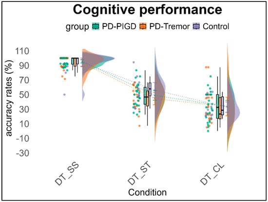 Cognitive performance (accuracy in %) across groups under the three dual-task conditions. Note: DT = Dual task, walking condition, SS = Serial Subtraction task, ST = Stroop task, CL = Clock task.