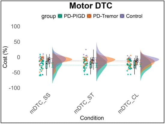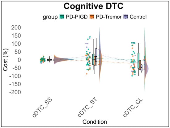 Performance in each task during DT conditions was compared to performance under ST conditions to calculate the interference effects (DT costs; DTCs). A negative sign is applied because higher scores represent poorer performance (e.g., longer times in the ST and DT). As a result, a negative DTC value signifies a decline in performance compared to the ST condition []. Therefore, the motor and cognitive DTCs are calculated as follows: Interference effects = −((Performance in DT − Performance in ST)/Performance in ST)*100. After calculating interference effects, a 3 (Group: PIGD, Tremor, Control) × 3 (Condition: DT_SerialSubtraction, DT_Stroop, DT_Clock) × 2 (Domain: Cognitive, Motor) repeated-measures ANCOVA, controlling for weekly exercise-related physical activity (time/week) spent in all exercise-related activities), was conducted. This analysis examined differences in interference patterns between healthy individuals and PD patients, as well as among motor subtypes within the PD group.