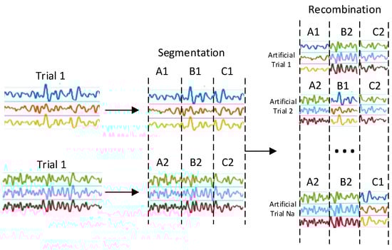 In the task of MI classification of EEG signals, this study addresses the problem of model overfitting caused by the small size of the dataset by adopting the time-domain segmentation and recombination (S&R) data enhancement method. It aims to expand the size of the dataset by generating new samples to enhance the recombination ability of the model. The specific steps include, firstly, defining a training set consisting of M trials , , where each trial denotes an EEG trial data, C is the number of signal channels, and T is the number of time steps. Then, each trial dataset is uniformly divided into K consecutive segments, each segment containing time steps. Finally, these segments are randomly selected from different trials of the same category and restructured in the original time order to generate a new artificial trial sample, as shown in Figure 3.