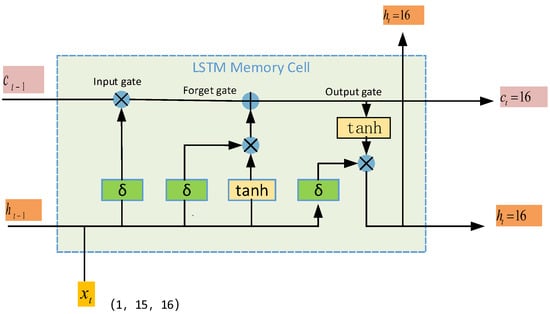 LSTM is a special type of RNN that is best suited for analyzing temporal and sequential data []. To capture the time-dependent features of EEG signals, this study introduces a two-layer stacked LSTM after the CNN module. The LSTM, with its unique gating mechanism and cellular state design, has a significant advantage in dealing with sequential data, as shown in Figure 4.