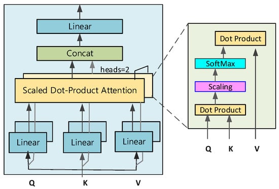 where , and are the projection matrices of the query, key, and value of the ith header, respectively. In calculating the attention weights, the query Q and the key K are subjected to dot product operation to get the similarity between them, and the dot product value is prevented from being too large by dividing it by the normalization factor . Next, the Softmax function is applied to normalize the normalized dot product to obtain the attentional weights for each key pair value . Finally, these weights are used to weight and sum the values V to obtain the output of each attention header. The formula is calculated as follows: