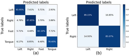 Average confusion matrices of the proposed CLTNet: (a) the BCI IV-2a dataset and (b) the BCI IV-2b dataset.