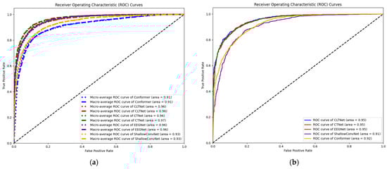 In this study, the ROC curves are further plotted and analyzed to provide insights into the performance of the CLTNet model on the BCI IV 2a and BCI IV 2b datasets, as well as its strengths and features compared to other models, as shown in Figure 7.
