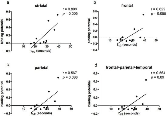 - Gunn, R.N.; Lammertsma, A.A.; Hume, S.P.; Cunningham, V.J. Parametric imaging of ligand-receptor binding in PET using a simplified reference region model. Neuroimage 1997, 6, 279–287. [Google Scholar] [CrossRef]