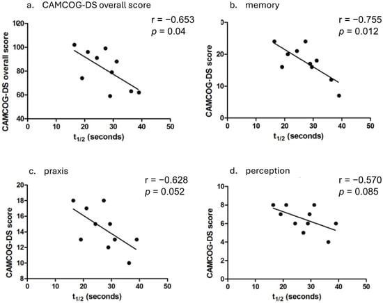 PCr recovery half-time significantly correlated with CAMCOG-DS memory domain scores (r = −0.755, p = 0.012; Figure 2b) and showed a trend toward correlation in praxis (r = −0.628, p = 0.052; Figure 2c) and perception (r = −0.570, p = 0.085; Figure 2d) domains. No significant associations were found with attention (r = −0.495, p = 0.145) or abstract thinking (r = −0.348, p = 0.324).