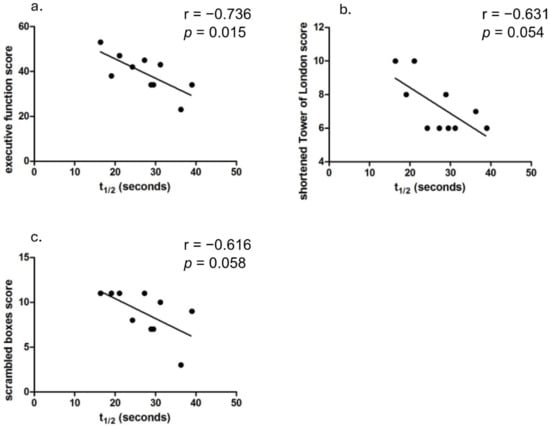 For executive function, Pearson’s correlation analysis showed a strong relationship between PCr recovery half-time and total executive function battery score (r = −0.736, p = 0.0153; Figure 3a). Significant correlations were also observed with the Tower of London task (r = −0.631, p = 0.05; Figure 3b) and there was a trending association with the Scrambled Boxes task (r = −0.616, p = 0.058; Figure 3c).