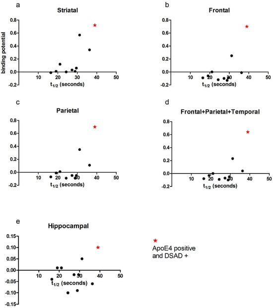 PCr recovery half-time (t1/2) correlations with amyloid binding data for the APOE Ɛ4 carrier, the only participant with dementia, highlighted across all analysed brain regions (a–e). Each data point represents an individual participant.