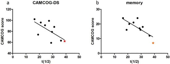 PCr recovery half-time (t1/2) correlations with cognitive performance data on the CAMCOG-DS overall score and the CAMCOG-DS memory domain for the APOE Ɛ4 carrier, the only participant with dementia (denoted by the star symbol) (a,b). Each data point represents an individual participant.