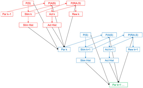 Bayesian update of the parameters of choice consistency. The figure shows three moments of parametric updates indicated in red, blue, and green. The first moment at time k (red) begins with a stimulus (Stim k) drawn from the probability distribution of stimuli (P(S)). With this stimulus, the brain calculates an action (Act k) from the probability distribution of actions given stimuli (P(A|S)). This calculation uses the set of parameters (Par k − 1) calculated at time k − 1. A reward (Rew k) then arrives from the probability distribution of rewards given stimuli and actions (P(R|A,S)). These stimulus and action are added to the histories of these values (Stim Hist and Act Hist). Given these histories and the new reward Rew k, a new parameter set (Par k) is computed, maximizing the Bayesian expected reward and action consistency. With this new set, one can repeat the process again at time k + 1 (blue). This process leads to the computation of a new parameter set (Par k + 1) that triggers the process again (green) and so on.